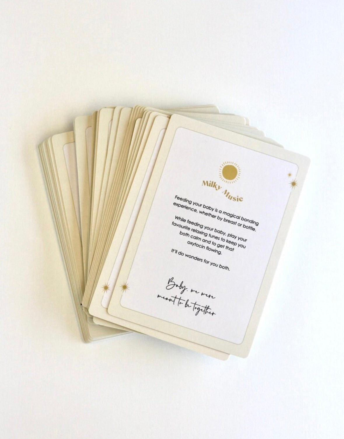 These are wonderful little additions to your hamper, each with an activity or tip to engage and bond with your new little one. From baby massage to journaling, outside activities and memory making, each card is unique and offers wonderful bonding moments.